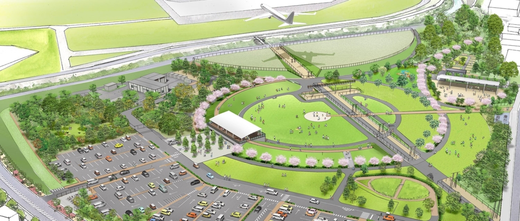千里川土手は空港のある右岸部分に滑走路を模した遊歩道や階段状の展望広場を整備。